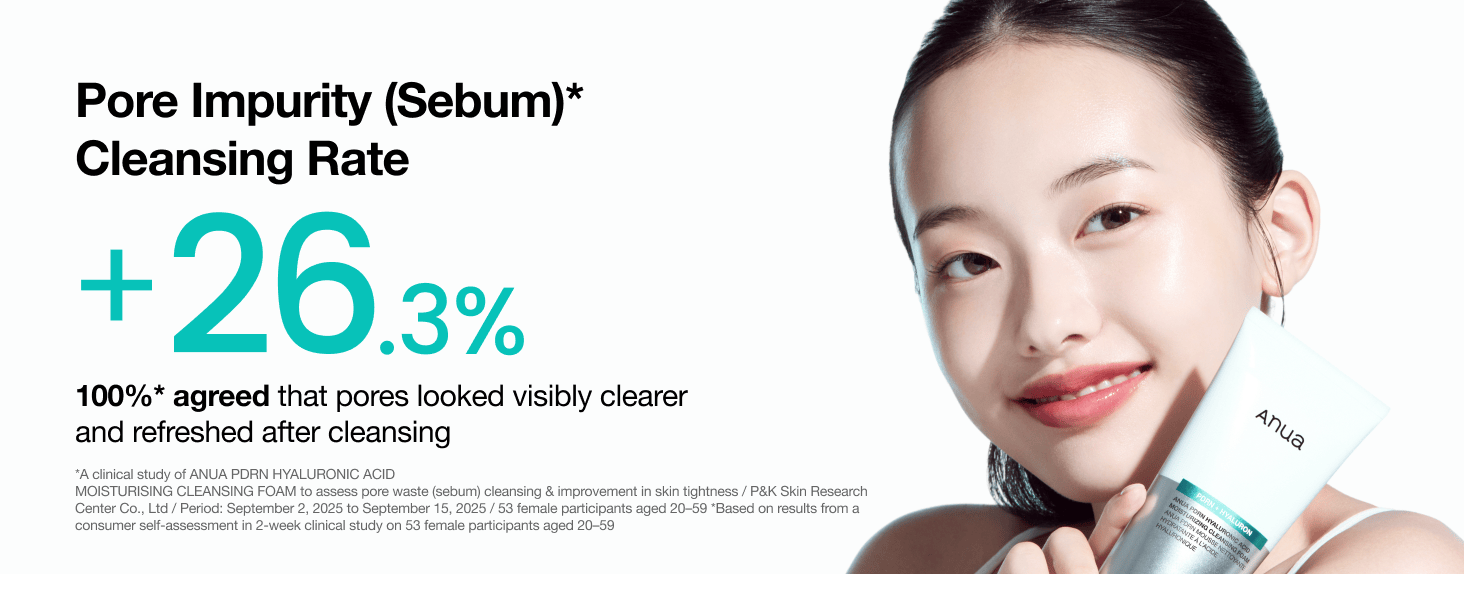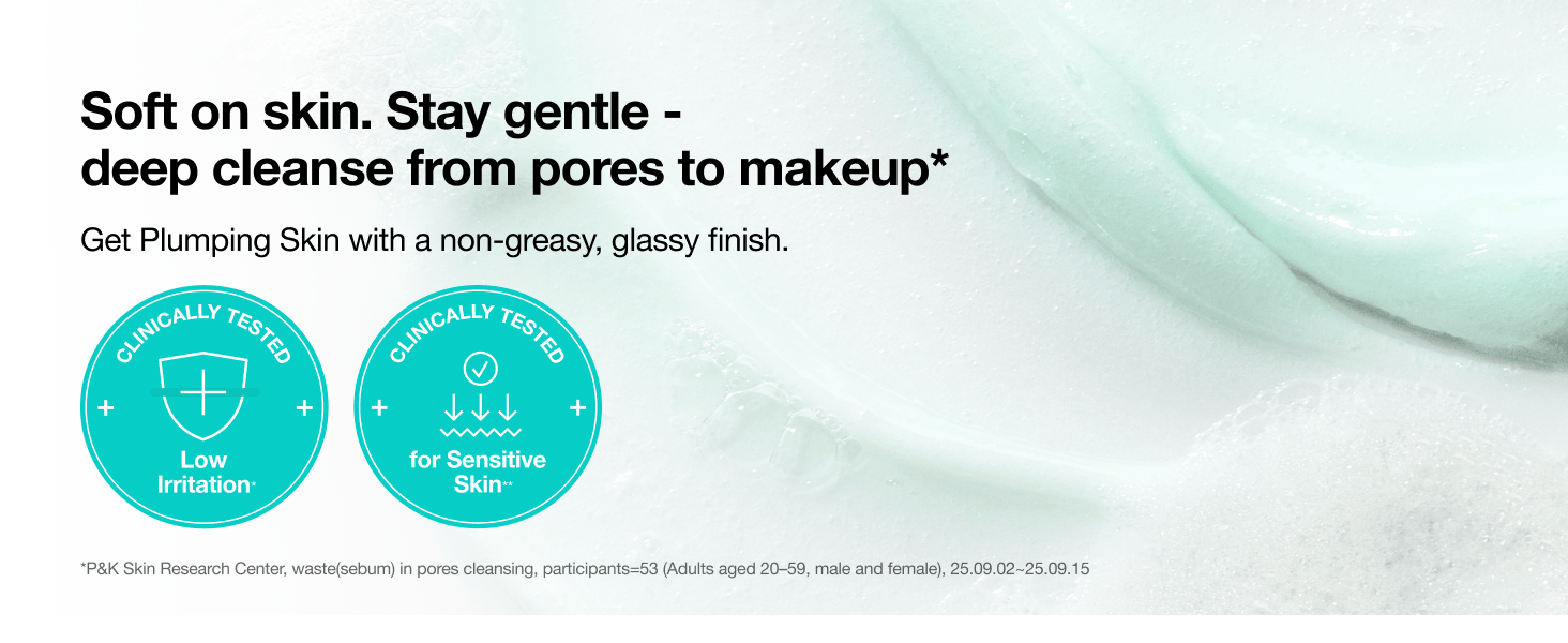 With a mildly acidic pH of 6, it creates a rich, cushiony lather that cleanses gently without stripping. The fine micro-bubbles help lift away sebum, leaving skin smooth, soothed. *P&K Skin Research Center, waste(sebum) in pores cleansing, participants=53 (Adults aged 20–59, female), 25.09.02~25.09.15