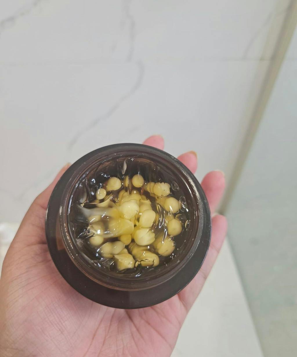 For the final step of the skincare routine, mix the yellow capsules and transparent gel on the back of your hand, then gently apply it to the skin. If you prefer a lighter formula, use a higher gel proportion. If you prefer a heavier moisturization and elasticity, use a higher capsule proportion.